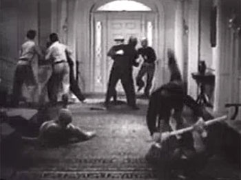 Though Junior G-Men’s characterizations are poorly handled, its plotting is solid enough. The initial tensions between Billy’s gang and the G-men causes the two sets of protagonists to battle the villains separately during the serial’s first third, adding a distinctive wrinkle to what would otherwise be a standardized hero-villain duel; even after Billy and the Junior G-Men combine forces, they still operate almost independently of the real G-Men, which keeps the action from becoming formularized. The writers also do a good job of building the action towards the climax in the later episodes, allowing the heroes to spot the villains’ hideout and raid it in Chapter Ten, locate Colonel Barton in Chapter Eleven, and smash the Order in Chapter Twelve–instead of reserving all this climactic action for the last episode. The final showdown, unfortunately, comes off as rather anticlimactic after the excellent buildup–but at least gives us a direct physical confrontation between heroes and villains, instead of having have the heavies finish each other off (as in so many Universal serials).