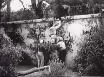 The chapter endings in Junior G-Men range from average to excellent, some of the highlights being Chapter One’s plunging-elevator cliffhanger, the Chapter Eleven ending that has the heroes about to be crushed by a different elevator, the Chapter Four plummet from a billing ledge (which might be stock footage, but is well-integrated into the new footage, if it is), and the Chapter Eight balcony crash. The blockhouse and warehouse explosions in Chapters Two and Six are memorable too, due to the good miniature work involved. However, far too many of the serial’s cliffhangers rely upon the dreaded “lived through it” resolution too common in Universal’s serials; time and again, protagonists Billy and Harry simply crawl out of the rubble of a violent crash or apparently devastating explosion.