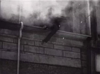 Above left: The initial blast of the Chapter Two blockhouse explosion. Above right: Billy Halop dangles from the ledge of a burning building, setting up the Chapter Four cliffhanger.