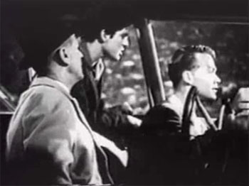 Above: Harry Trent (Kenneth Howell, far left) watches as Jim Bradford (Phillip Terry) reprimands Billy (Billy Halop, seated on the desk corner).