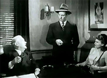 Edmund MacDonald makes a somewhat offbeat but interesting criminal mastermind; comparatively young and decidedly brawny, he seems much more physically threatening than the average brains heavy, while his aggressively authoritative and sneeringly confident manner make him credible as a boss villain. Danny Morton, slicker but less belligerently self-assured in manner, provides a good contrast to him as his cousin and chief lieutenant Derek Lamont. Jane Randolph, probably best-known for her supporting roles in Cat People and Abbott and Costello Meet Frankenstein, is smug, sly, and sophisticated as Morton’s equally villainous sister Marina; she does little but assist MacDonald and Morton in verbally recapping the plot, but does that quite well.