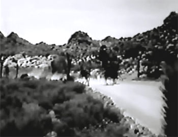 The gun battle in the rocks in Chapter Nine is a little better, since it features more movement on the part of the combatants–but their ducking and dodging is still performed in irksomely pedestrian style. The attack on the way station in Chapter Eight is more dynamic than most of the serial’s shootouts; the wagon chase that follows it is also quite good. The same is true of most of the serial’s other chase sequences, like the excellent pursuit/rescue of the stagecoach in Chapter Four and the wagon chase at the end of Chapter Twelve. The backdrop for these and other pursuits is the semi-desert Pioneertown area, also seen in Son of Geronimo; as in that serial, it presents a remote and uncivilized appearance that seems appropriate to a supposed frontier region. The Pioneertown Western street and its buildings also figure in the chapterplay; Katzman had not yet abandoned interior shooting at this point in his serial-producing career.