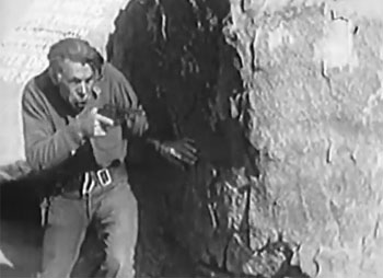 The serial’s most memorable action scene, however, is the lengthy clash between Tyler and the Night Riders at the “Canyon of Calamity” in Chapter Six–a terrific sequence that occupies about half the episode and boasts a short but fierce shootout, an ingenious piece of trickery by Tyler and his ever-helpful horse, a roof-climb, a couple of good fistfights, and Tyler and Dorothy Gulliver’s exciting attempt to escape the canyon by clambering down a ramshackle trestle. The Bronson Canyon area provides a striking backdrop to this prolonged battle; Bronson Cave also puts in an appearance at the beginning of the sequence, while Kernville’s forests, roads, canyons, and rocks provide the setting for most of the serial’s other action scenes–among them the chase and shootout in Chapter Four, and the excellent stampede sequence that climaxes Chapter One. Other action highlights include Chapter Two’s short chase and the pair of second-story balcony leaps that conclude it, the chase up and down the burning staircase later in the same episode, and the chase and fight on the same stairs in Chapters Nine and Ten.