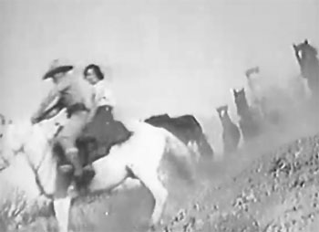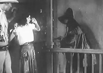 Both staircase sequences are made especially striking by director Ross Lederman and cinematographers Joseph Novak, Benjamin Kline, and M.A. Anderson–who fill the scenes with memorably stylish downward shots that give a dizzying sense of the stairwell’s depth. Director and cameramen also show considerable style in their careful visual framings of the Night Riders’ repeated horseback forays; these scenes, incidentally, were originally accompanied by the Riders’ rendition of the “Like shadows/From out of nowhere…” song later heard in Fighting With Kit Carson, but the ballad has been replaced by wordless music in all extant prints of Phantom–prints derived from a television reissue of the serial. This alteration has an odd effect on some scenes, particularly the Riders’ advance on Blair’s ranch in Chapter Five; the dramatic close-ups of each character reacting to the song look silly once the song itself has been removed. The TV version of Phantom also appears to have been cut in a few places; two chapters are unusually short, and a scene of Jim Lester dancing with Blair’s daughter (which looks as if it would fit into one of the truncated episodes) appears twice in chapter-opening recap scenes, but never surfaces within a chapter.