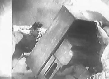 Above, top left and right: Night Riders are knocked over by rifle-packing Tom Tyler during the battle at Bronson Canyon in Chapter Six. Bottom left: a lamp crashes to the bottom of the stairwell and starts a fire, as Tyler pursues the Phantom and the captive Dorothy Gulliver down the stairs towards the end of Chapter Two. Bottom right: Tyler slugs an opponent off of the staircase’s top landing in Chapter Nine, as Dorothy Gulliver watches.