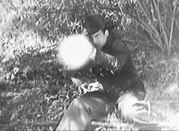 Beebe, Gittens, and Cohn are also to be commended for providing an acceptable final-chapter explanation for a lengthy earlier sequence that would otherwise have been negated by the revelation of the Night Riders’ true identities–a scene whose equivalents went blithely unexplained in Mascot efforts like The Lightning Warrior and The Galloping Ghost. However, Phantom’s screenplay is far from perfect; like most Mascot serials, its basic plot is too slight to prevent repetitiousness from creeping into the narrative–although its compact ten-chapter length keeps the storyline from wearing itself out too much (Phantom was the last sound serial to feature so low an episode count). Additionally, the writers manage to mask the story’s thinness by subjecting the characters to one puzzling or exciting incident after another, in classic Mascot style.