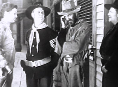 The power struggle between the patient Red Fawn and the resentful Young Wolf is given more attention than the serial’s romantic entanglements; it’s offbeat and fairly interesting, and culminates in memorably ironic fashion. The best of the serial’s subplots, however, is the one centering around the disgraced Lieutenant Roberts; his interactions with his former friend Lieutenant Cook and with Belle Meade could have been better-written, but are still compelling and often genuinely moving; the conclusion to his character arc is one of the serial’s dramatic highlights. The campaign of Indian Agent Fitzpatrick and Wild Bill Hickok to clean up the outlaw-ridden town of Blackpool at first promises plenty of excitement, but this plot thread is disappointingly abandoned not long after Hickok makes his first entrance; far more footage is (irritatingly) devoted to young Bobby Trent’s attempts to teach his dull-witted friend Buzz how to scout and blow a bugle.