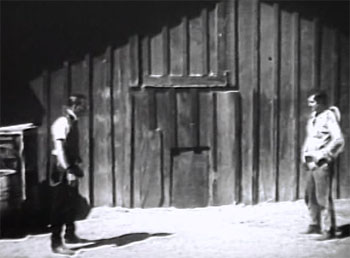 Above left: The opponents in the fight atop the wagon team face off. Above right: Another faceoff, this one beginning the final gunfight between Reed Howes (left) and Rex Lease.
