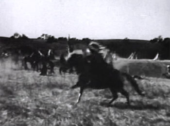 The attack on the wagon train in Chapter One and the longer Chapter Ten attack on the fort (a good sequence, and one of the serial’s few protracted action scenes) also feature stock footage, but combine it pretty skillfully with new footage. The outlaw attack on the pay wagon in Chapter Eight consists entirely of new footage; it’s energetic, but is staged and edited in such chaotic fashion that it’s hard to follow the action. The first phase of the Little Big Horn sequence in Chapters Fourteen also suffers from this problem, but the battle’s conclusion in Chapter Fifteen–with Custer and his men standing at bay in a tightening ring of mounted Indian attackers–is pretty well-done, as is the final gunfight between Cardigan and Blade that follows close on the Last Stand’s heels. The serial’s most memorable action scene, however, is the attack on the Trent’s wagon at the end of Chapter One, which has stuntmen Yakima Canutt and Ken Cooper (doubling Rex Lease and Chief Thundercloud) fighting on a team of horses and then falling beneath them–although this stunning piece of stuntwork is somewhat diminished by being filmed entirely in an extreme long shot.