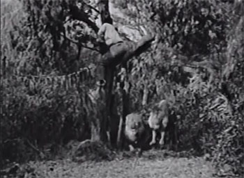 Perhaps the most memorable animal attack in Wild is the novel sequence in Chapters Six and Seven, which has the villainous Harris first using a full-sized elephant to threaten the heroine and then having the pachyderm lift the hero off the ground when he interferes; the animal must have been well-trained, since we can clearly see that both Walter Miller and Nora Lane are actually being held by its trunk (the elephant, and a second one, also pop up during the first-chapter tiger hunt, during which several actors ride on their backs). In a more traditional action vein, Walter Miller’s tree-climbing and vine-swinging flight from a pair of lions and a pair of policemen in Chapters Eight and Nine is quite good, as the final horseback chase; the earlier horseback chase in Chapter Ten (which has the hero standing on his galloping steed before leaping to pull his adversary from his horse) is also noteworthy, as is the fierce and rather violent grapple between Walter Miller and Tom Santschi in Chapter Seven. Miller, in most of these scenes and in several other good climbing and running sequences, seems to be doing his own stuntwork, as do his co-stars–although Miller is almost certainly doubled (probably by Canutt) for the leap from the horse and the vine-swinging.