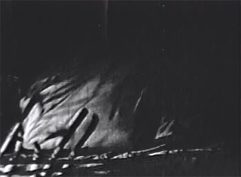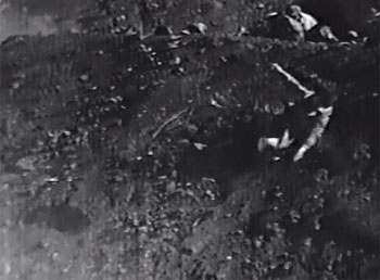 Above, top right and left: Arthur McLaglen tosses Carroll Nye before starting to throttle Walter Miller at the end of Chapter One. Bottom left and right: Walter Miller plunges into a covered-over tiger pit, while at the same time Nora Lane tumbles down a volcanic slope (after being tripped by the mystery man in the black glasses, who’s hiding behind a rock at the top of the shot).