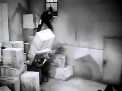 The fights themselves are staged capably if routinely by director James W. Horne–who, in his first solo directorial assignment of the sound-serial era, largely steers clear of the slapstick six-against-one fights that characterized almost all his later efforts. Star Victor Jory is presumably doubled, although the Shadow mask and Horne’s preference for shooting action in longer shots make it impossible to ascertain who’s doing the doubling; the serial’s team of henchmen (durable heavies like ex-wrestler Constantine Romanoff and occasional stuntmen Chuck Hamilton and Jack Ingram) seem to be doing most of their own fight work. The fight on the stairs in Chapter Six, the Chapter Seven warehouse fight (which features a good rope-swing by the hero), and the later warehouse fight in Chapter Thirteen (which makes creative use of an array of boxes) are among the best of the serial’s various fistic encounters.