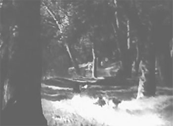 Above left: The killer dogs chase White Cloud through the woods. Above right: The villains trail behind their dogs during the same chase sequence, their reflections picturesquely caught by the lake.