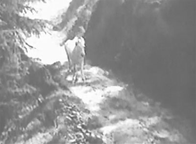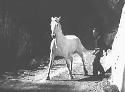 Above left: A long shot of a rugged “Canadian” (Iverson’s) cliff (the objects falling down the side are–supposedly–the hero and a henchman). Above right: Charles King rides along a forest trail in the San Bernardino National Forest.