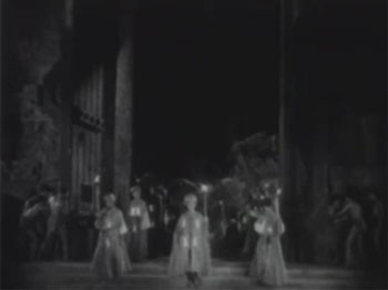 Chandu’s strategic use of the many A-film sets located on RKO’s Culver City backlot also boosts the quality of its visuals considerably; the most notable of these is the iconic Great Gate of Skull Island from the classic King Kong, which is seen here as the towering doorway of the Ubasti temple. Other impressive Culver City locations well-utilized in Chandu include the mansion that figures in the early episodes, the ship on which the Chandler party journeys, the streets and houses of the Eastern seaport city of “Suva,” the thick jungles and underground tunnels on the island of Lemuria, and the huge cave (complete with a gigantic stone cat idol) in which the Ubasti cult conducts its rites. This cavernous temple, incidentally, is generously supplied with extras whenever said rites are performed, helping to make the Ubasti cult seem like a genuinely formidable big-scale organization; the party scenes at the mansion and the sequences set in the streets of Suva also are enhanced by the presence of plenty of bystanders.