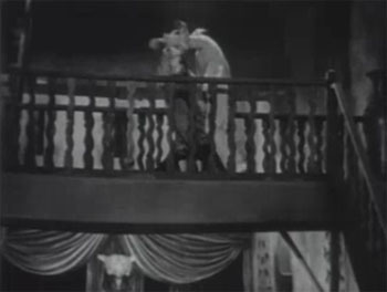 A fistfight also figures into the serial’s single most memorable action sequence, although it’s only a minor contributor to the scene’s effectiveness. Chandu’s Chapter Four rescue of Nadji from an underground Ubasti temple in Suva is the scene in question, a sequence that has Vindhyan preparing to sacrifice Nadji and showing her a nightmarish vision of his fellow-cultists on Lemuria relentlessly chanting “Princess Nadji, we await thy soul”–while Chandu races down a circular staircase to the rescue, eventually bursting into the temple and battling Vindhyan on a platform above the sacrificial fire (Lesser later used this standout sequence as a fitting climax to the first of the two features he concocted from Chandu).