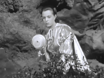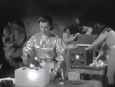 Though Columbia’s backlot and sound-stages provide the houses and streets of Richmond in the first chapter, the pirate-ship’s sides and deck (the same set later featured in Great Adventures of Captain Kidd), and the artificial rock formation by which the good guys sometimes make camp, most of Island’s action is filmed at the scenic Corriganville movie ranch–on its slopes, in its forests, on its lake-shore, and at one of its cabins. Though he undoubtedly saved himself a lot of rental fees by this extensive off-lot shooting, Katzman cuts additional corners in the exteriors and properties department; we’re never even shown a single establishing shot of the Volcano Men’s alleged village, our view of their home territory being restricted to a hut interior. Even more noticeable is the disappointing but money-saving omission of Captain Nemo’s Nautilus; for the first and probably the last time in the character’s screen history, he appears without his famous submarine and is reduced to living in a cave laboratory furnished with a few sci-fi props. The Mercurians also house themselves and their gadgets in a cave, but at least are given an imposing means of transportation–the flying “Time Top” from Katzman’s earlier serial Brick Bradford, which appears via airborne footage from Bradford and some stationary new shots of a life-size mock-up (which, unfortunately, doesn’t really look like the contraption seen in the stock shots). More stock footage is evident in the recurring shots of the island’s rumbling volcano; oddly enough, these visuals are borrowed from a Republic serial, Hawk of the Wilderness.