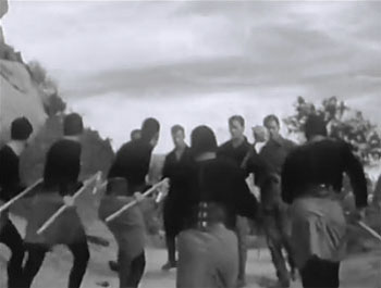 The serial’s tediousness is accentuated by the innumerable scenes of characters slowly walking through the “island” landscape, as they search for or shadow each other; Chapter Nine in particular is almost entirely filled with this ambulatory padding. The serial’s equally frequent running scenes are a little livelier than the walking ones, but are too often flattened by the mechanically repetitious way in which they’re filmed: to provide producer Katzman with yet more visual padding, director Spencer Bennet continually has the pursued parties run across a stretch of landscape, and then follows their flight with near-identical footage of the pursuers jogging across the same scenery, duplicating the movement of their quarry–and then repeats the cycle on another piece of land; the heroes’ flight from the Volcano Men in Chapter One provides the first of many examples of this excessively routinized chase-filming style.