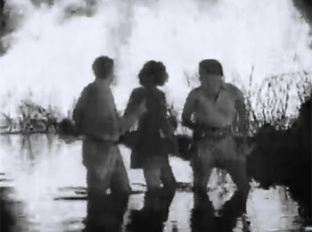 The cliffhanger sequences that occur outside the Caves of Nacros are equally memorable, inventive, and well-done; standouts include Nyoka’s fall from a log “bridge” that spans a dangerous crevasse in Chapter Seven, her fall into an impromptu oil-refining vat in Chapter Eight, and her endangerment by a rampaging gorilla in Chapter Ten–a sequence that is so effectively and dramatically filmed that it comes off as strikingly tense and even scary, despite the fact that the threat involved is a typically fake-looking serial ape (played by Emil Van Horn). The Chapter Fourteen spear-trap cliffhanger is first-rate as well, as is the visually spectacular ending to Chapter Three–which has Nyoka, Jack, and Curly trapped in a blazing oil swamp after an exciting and well-shot torchlight chase (this sequence also serves as a clever means of introducing a plot point–the existence of crude oil in the Simbula swamps–that becomes pivotal in later episodes, when Jack loses his airplane’s gas supply and is forced to try and make his own fuel).