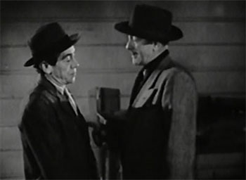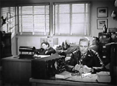 Like most early Katzman serials, Harrigan is filled with pace-killing padding; director Derwin Abrahams repeatedly wastes screen time on scenes of characters walking, driving, or flying around at painfully slow speeds. This padded plodding even intrudes into Hop’s climactic scene, and kills any suspense the sequence might have had: the serial’s finale has Hop, Tank, Ballard, and a sheriff supposedly racing the clock, in order to stop Tobor from blowing up the entire world–but their “race” is depicted through a series of shots that show them trudging lethargically up an easily-ascendable hillside, moving with all the swiftness and determination of middle-aged golfers in Florida. Less laughable, but equally tiresome, are irrelevant and needlessly prolonged scenes like the laborious post-robbery cleanup in Chapter Two, Hop and Tank’s slow and careful Chapter Five efforts to sneak up on a hideout that proves to be abandoned, and the regular conferences at Arnold’s office (during which the characters painstakingly tell each other about events we’ve already seen). While sequences like these are milked tediously, scenes that could have been exciting take place off camera–like the last-chapter explosion of Tobor’s experimental plane, which is excitedly described by Hop but is never shown (thus saving the economically-minded Katzman from having to shell out for miniature work).