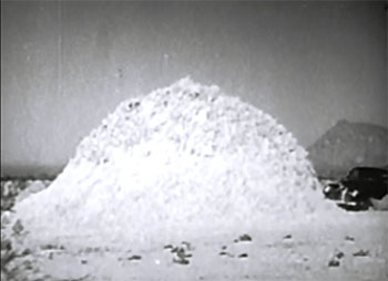 Jackie’s aerial escape from Tobor’s mountain lair in Chapter Twelve (which sets up the above-mentioned plane “rescue”) is one of the few aerial sequences in the serial that’s visually exciting, featuring as it does some impressive shots of the towering mountains that the plane must circumnavigate; the episode’s cliffhanger, which has the plane hitting one of the peaks and going into a spin, is good too–but is resolved by a blatant cheat in the following episode. Three other chapters (One, Two, and Eleven) end with plane-in-trouble cliffhangers too; in all of these sequences, the good guys’ planes start acting up in midair but never actually crash, unlike the aircraft in other aviation serials. This expedient makes the airborne cliffhangers rather flat, but it also (like the off-camera destruction of Tobor’s plane) does away with the need for miniature work.