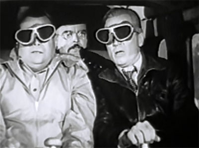 Above: John Merton orders the blind-flying Sumner Getchell and William Bakewell to drive directly towards a mountain at the end of Chapter One of Hop Harrigan; the terrified “heroes” avoid disaster, but the viewers don’t.