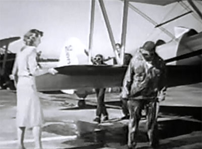 Above: An apparently tense aerial rescue turns out to be a mere rehearsal that concludes with comedy-relief mechanic Sumner Getchell (far right) falling into a mud puddle as Jennifer Holt, Buzz Henry, and William Bakewell (latter two behind plane) laugh. This opening sequence foreshadows the generally disappointing serial to follow.