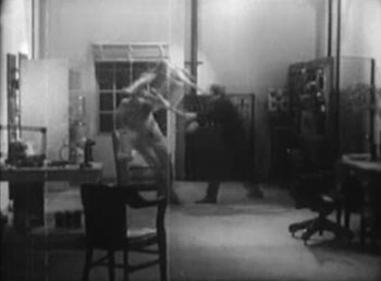 As is always the case when Canutt is on hand, Shadow’s fight scenes–though crude compared to later serial brawls–are more exciting and more visually interesting than the early-1930s norm; combatants regularly jump from heights, violently slam each other to the ground or against walls, and flip each other through the air, instead of simply standing up and swinging frenziedly at each other. The Chapter Seven radio-room fight between the hero and a suspect in Chapter Seven is particularly dynamic; the Chapter Two wax-museum fight (which Canutt concludes with a nice leap from a staircase), the fights in the crate-crammed storeroom in Chapters Four and Nine, and the Chapter Ten fight in the Shadow’s headquarters (during which a heavy gets energetically tossed over a table) are all very good too.
