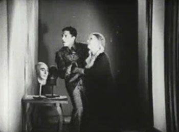 The Shadow himself is one of Mascot’s better all-round mystery villains; the ominous jamming of radio communications that occurs whenever he’s about to strike, the death-ray that he successfully uses to kill off more than one victim, and the harsh and threatening whisper in which he speaks combine to give him a nicely menacing aura. The black shadow he throws over the scene from time to time (projecting it via a “television” device) is menacing too, though not exactly original; the cloak and broad-brimmed hat sported by this silhouette give it a highly suspicious resemblance to the Shadow—the famed magazine and radio-show character, who’d first been given a near-identical visual appearance in a series of Universal shorts earlier in the 1930s.