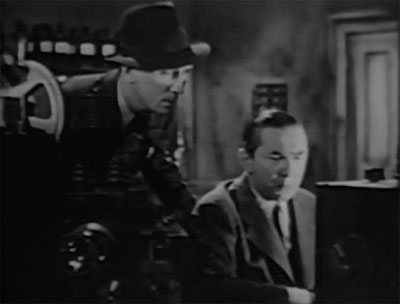 However, neither the trip or the villainous squabbles do much to accelerate the lethargic pace of the serial. Like Katzman’s other Victory serial, Blake of Scotland Yard, Chinatown was structured so that it could be smoothly edited down into a coherent seventy-minute feature; as a result, it’s padded out and slowed down by footage designed to be easily removable– examples including Poten’s interminably prolonged setup of his telephone death-trap in Chapter Four, the endless “dramatic” closeups that drag out Sonya’s Chapter Twelve confession, and (most noticeable of all) the bizarre stock-footage disaster montage that’s abruptly shoehorned into Chapter Fifteen, interrupting the search for Poten. The latter footage makes so little sense in the context of the plot that I tend to think editor Carl Henkel must have accidentally inserted it in place of some police-dragnet stock footage (which would have fit in logically enough). Numerous dialogue sequences also serve to pad out Chinatown’s running time; some of these are absurd and self-contradictory–like the several scenes in which police detective Walters accuses Andrews of being behind the Chinatown crimes after Poten borrows murder methods from Andrews’ books, then admits Andrews must be innocent after the writer is nearly killed by one of these methods, and then inexplicably goes back to accusing Andrews.