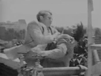 Above left: Luana Walters and Bela Lugosi at the railing of the “ship.” Above right: Herman Brix and Joan Barclay stop to fix a tire on the road, unaware Lugosi’s car is coming into sight behind them.