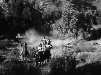 The canoe cliffhanger is juxtaposed with Tom’s apparent shooting from his horse by Indians; Chapter Two also concludes with a double cliffhanger in which Tom is apparently shot by Steve’s friend Bordeau and Ann is pitched from a cliff by a misbehaving horse. Most of the subsequent cliffhanging perils are faced jointly by hero and heroine; the most memorable of these is the conclusion of Chapter Four, which has Tom, Ann, and a prisoner crossing a suspension bridge that’s struck by lightning. The “live-through-it” resolution of this cliffhanger is unimaginative but makes sense enough, while the similar resolutions of the Chapter Three wagon crash and the horsefalls in Chapters Two and Five are a little less believable–though not in the same unbelievable league as some of the resolutions in other Universal chapterplays.
