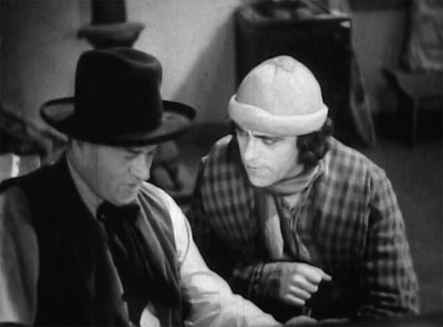 Clancy takes its title and its opening quotation from a poem by Robert W. Service, but its screenplay–the work of Ella O’Neill, Harry Hoyt, and Basil Dickey–is original. Like the storylines of most of Universal’s other early-1930s serials, the main plot of Clancy is simple and small-scaled, but easily captures the viewer’s interest through the incorporation of many strong character moments. Most of these arise from the affectionate relationship between hero Tom Clancy and his brother Steve–which is not just used as a pretext to get the hero into a struggle with the villains, as in so many later chapterplays. Instead, it’s established elaborately and movingly in the unusual opening sequence, in which Tom presides over the delivery of Steve’s child–giving a genuinely poignant air to the ensuing sequences in which Tom reluctantly but firmly pursues the fugitive Steve through the wilds; this pursuit is concluded (in Chapter Three) with another moving scene in which the two brothers re-establish their trust in each other. The scene in which Ann Laurie grimly demands to confront her father’s supposed killer, then reacts with shock and disbelief when she learns that Steve (whom she’s already met and befriended) is the suspect in question, is nicely dramatic as well; Ann’s commiserations with Steve’s worried wife also add a welcome human touch to the serial.