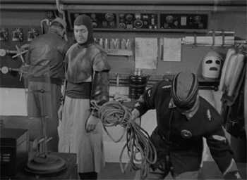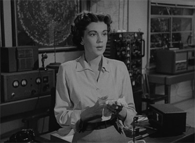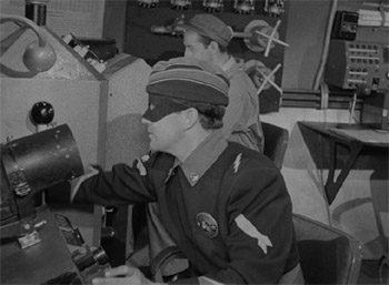 However, Republic’s producers did not bring Radar Men’s Commando Cody, George Wallace, to television; instead, they retained the services of Judd Holdren, who’d already established his sci-fi credentials in Sam Katzman’s movie-serial version of Captain Video. As in his serials, Holdren in Cody does an effective job of snapping out urgent commands and pseudo-scientific jargon with stern assurance, but rarely displays anything in the way of affability or emotion–and is also prevented from ever sounding quite as commanding as he should, due to a pronounced Midwestern drawl which excessively softens the edges of his voice. As a result of his sternness and vocal blandness, Holdren comes off as a serviceable lead, but never a particularly compelling or interesting one. He’s further hampered by a Lone-Ranger-like mask, which is briefly explained (rather unconvincingly) by the statement that Cody’s work is so top-secret that not even his closest aides can be allowed to know what he actually looks like. Supposedly, this masking was prompted by the thought that, if the Cody show became a hit, it would be easy for Republic to replace Holdren in case he asked for a higher salary; on screen, though, the mask merely serves to further depersonalize an actor already lacking in personality.