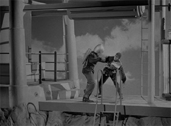 The Ruler sends an agent (Stanley Waxman) to Earth in a spaceship that is destroyed by the cosmic dust blanket but which deposits its passenger safely on terra firma. This agent joins forces with the Ruler’s Earthling agent Dr. Varney (Peter Brocco); the two then pose as friendly scientists and win Cody’s confidence by providing him with a valuable new extraterrestrial element. Their goal is to steal Cody’s spaceship–which, unlike the Ruler’s ships, is capable of penetrating the dust blanket. Peril benefits from a good performance by Waxman (also seen in Zombies of the Stratosphere) as the smoothly saturnine guest-star villain, and from several scenes set aboard Cody’s spaceship–nicely realized through a good interior set and through a Lydecker miniature. That said, director Fred Brannon is unable to milk much tension out of a protracted but static sequence in which Cody tries to repair the damaged ship in midair; this sequence, however, does provide nice foreshadowing for the climactic action. All told, the second episode is an improvement over the first, but still rather flat. Ronald Davidson again does scripting duties.