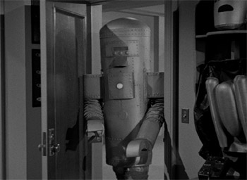 Above left: The robot invades Cody’s office. Above right: Sandy Sanders and Lyle Talbot oversee Richard Crane’s brainwashing.
