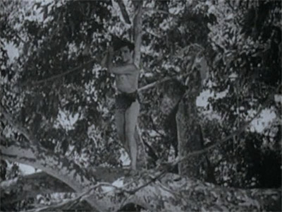 Above: Well, at least he looks the part: Buster Crabbe strikes a good Tarzan pose in the treetops.