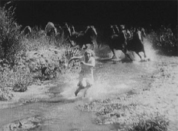 Above left: A lighting bolt sends Tarzan and his tree branch falling onto a hut containing the Brooks expedition, in a rather impressively staged shot. Above right: Another nice (albeit dangerous-looking) piece of staging, as Jacqueline Wells (or her stunt double) flees a herd of stampeding horses without the benefit of any process-screen work.