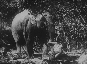 Above left: Melvin Koontz (doubling Buster Crabbe) seems to be losing his tussle with Jackie the lion at the moment. Above right: Tantor the elephant to the rescue.