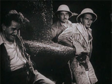 Frank Lackteen figures in the first two chapters as the expedition’s Arab head porter, who turns out to be a slaver and kidnaps the heroine; Symona Boniface is his wife and accomplice, and Philip Sleeman is the odious-looking sheikh who appears to be their best customer. Al Kikume can be spotted as one of the warriors of Zar; Ivory Williams evidently played a comic-relief black porter named Unga in the original serial, but all of his dialogue and almost all of his “comic” scenes are absent from surviving prints. Jack Leonard, who played an ape in the MGM feature, does similar duty here; there’s also a genuine chimpanzee on hand to screech, do backflips, get chased by bigger animals, and generally imitate MGM’s “Cheta.”