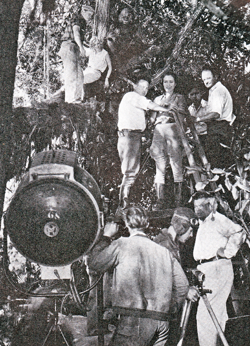 Above: MacRae’s regular director, Ray Taylor (center platform, hand on ladder) sets up a shot for the lost serial Danger Island on Universal’s excellent jungle backlot. Beulah Hutton is standing next to Taylor, while Lucile Browne is on the upper platform.