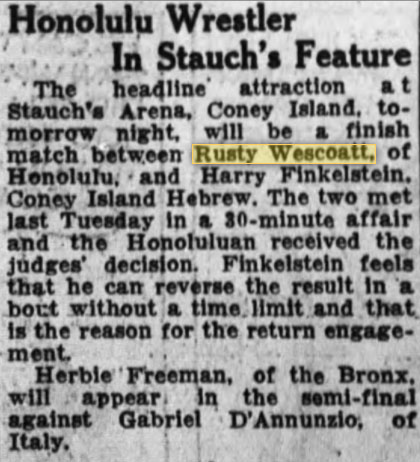 Next, a 1935 Brooklyn newspaper clipping about one of Wescoatt’s innumerable wrestling appearances: