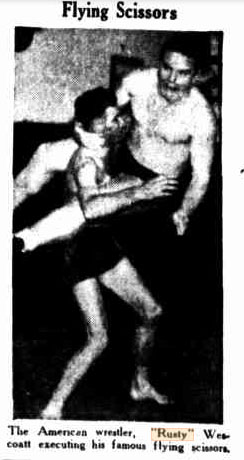 Finally, three clippings from various 1937 Australian papers–one describing Wescoatt’s “flying scissors” move (evidently his wrestling signature), one showing him utilizing it in the ring, and one general publicity photo: