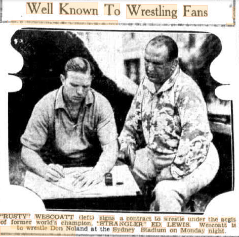 Next, here’s a 1936 American newspaper photo reproduced in a 1937 Sydney newspaper, showing Wescoatt signing a contract with the famous Ed “Strangler” Lewis.