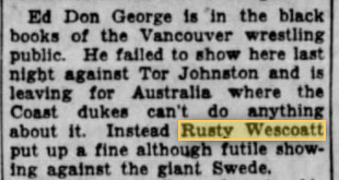 While researching my recent Rusty Wescoatt biography, I turned up an enormous amount of press clippings concerning Rusty’s wrestling days, as well as his football and swimming exploits, through both Newspapers.com (subscription, Ancestry.com, or Facebook account required for full access), and the free Australian newspaper archive site Trove. I thought I would share some of these through the Elsewhere series.