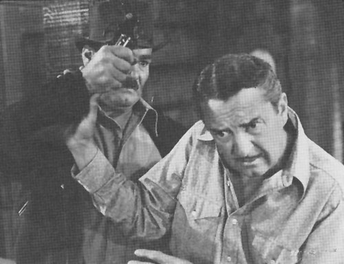 Washburn continued to work as a character player in B and occasional A features during the remaining years of the 1930s and in the early 1940s; in 1940 he appeared in his first serial since Jungle Jim, Republic’s King of the Royal Mounted. As in Jim, he played a villain–Matt Crandall, a traitorous Canadian mine-owner who made a secret deal with Nazi agents, agreeing to provide them with the militarily valuable mineral “Compound X.” Washburn, whose character pretended to assist the Mounties’ investigation of the spy ring for most of the serial, affected friendliness with such ease and such seeming sincerity that it made it made the good guys’ misplaced trust in him seem entirely understandable. He also balanced slyness and furtiveness to good effect when Crandall was participating in skulduggery; he was crafty and poised enough when issuing routine orders to henchmen, but lapsed into cringing nervousness when in danger of exposure or when reporting failures to his superior, hard-bitten Nazi agent Kettler (Robert Strange).