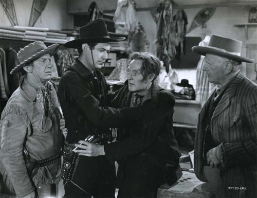 Above: Forrest Taylor tells John Mack Brown (in black outfit) a bogus story in The Oregon Trail (Universal, 1939). Fuzzy Knight is on the far left, Ed LeSaint on the far right.
