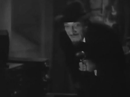 Picorri followed his Robinson Crusoe of Clipper Island turn with his most famous chapterplay characterization—the hunchbacked brain surgeon Moloch in the 1937 Republic serial Dick Tracy. This ominously-named medical man was the scientific aide to a master criminal called the “Lame One;” to further said criminal’s ends, he performed an operation that changed G-man Dick Tracy’s brother Gordon into an amnesiac killer, and unctuously gloated over the success of his evil experiment throughout the remainder of the serial—when not expressing his hope for a chance to perform the same operation on Dick Tracy himself; he came scarily close to achieving this horrible goal in the serial’s suspenseful climactic sequence. Aside from his surgical activities, Moloch did little in Dick Tracy but discuss strategies with the Lame One—but he emerged as one of the creepiest and most unsettling characters in Republic’s entire serial canon, thanks in large part to Picorri’s performance. His gleefully ghoulish smiles and leers made him seem completely deranged, but his crisp, confident, and precisely-enunciated delivery of his lines also made him seem dangerously shrewd and intelligent; the pieces of sound villainous advice he periodically offered to the Lame One sounded just as convincing as his mad-scientist ponderings–like his academic speculation on the possibilities of transferring a cat’s brain into a human skull. Speaking of cats, Moloch spent almost all of Dick Tracy affectionately stroking a small black feline, an eerily incongruous bit of business that enhanced the character’s menacing aura and helped Picorri steal many scenes (not that he needed too much help in that department).