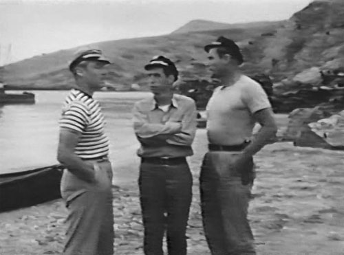 Above: Tristram Coffin confers with Tommy Farrell (center) and Buster Crabbe on the beach at Taluha (Catalina Island) in Pirates of the High Seas (Columbia, 1950).