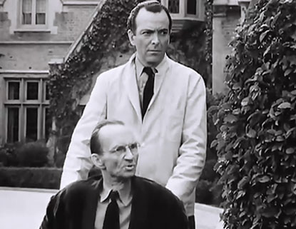 Above: Professor Hammil (William Fawcett) rebukes the off-camera Vicki Vale (Jane Adams) for trespassing on his property in Batman and Robin (Columbia, 1949). Hammil’s attendant is played by Leonard Penn.